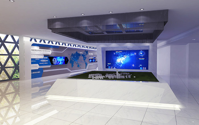 企业展厅策划时,整体为了更好突出城市宣传,在整体的色彩方面搭配简洁,选用白色和蓝色进行搭配设计,同时,在中心位进行沙盘展示,以及电子屏幕展示,更好的让参观者了解到城市的特色、发展等